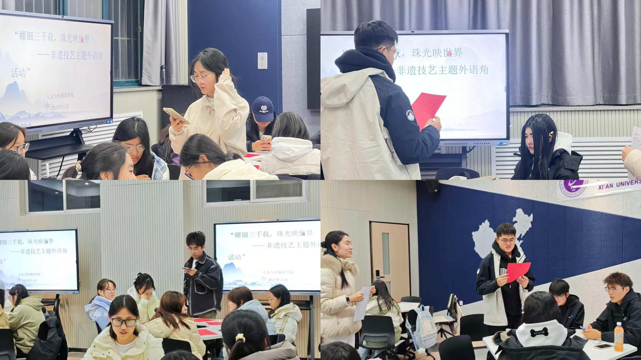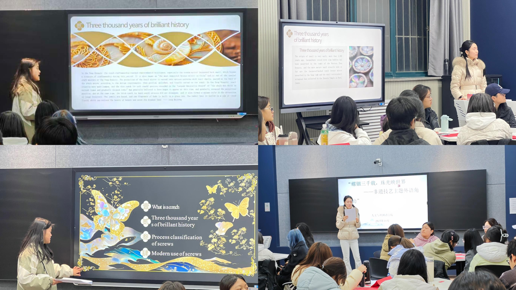 在主题讨论环节,同学们围绕“如何推动螺钿工艺的国际传播”“如何通过跨文化交流让非遗融入现代生活”以及“国际语境下螺钿文创产品的创新思路”等议题展开深入交流。大家结合专业知识,积极运用英语表达见解,在思维碰撞中共同探索非遗文化的当代价值与国际传播路径。通过双语交流,同学们不仅加深了对非遗传承现实意义的理解,也提升了英语表达能力与跨文化沟通素养,展现出年轻一代对传统文化的热爱与创新活力。