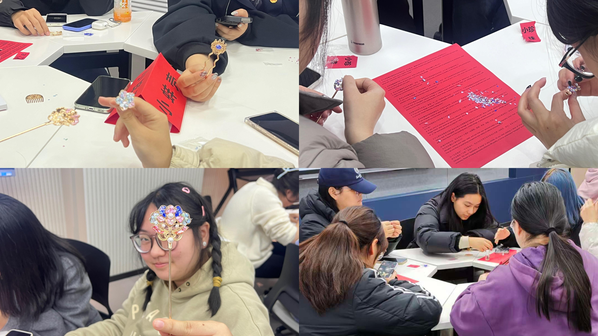实践环节将现场气氛推向高潮。在配备齐全的材料与工具前,同学们分组协作,亲手完成从选贝、设计、镶嵌到打磨、定型的螺钿作品制作流程。一枚枚胸针、一支支发簪在指尖逐渐成形,大家在亲手创作中切身感受到传统匠人的专注与智慧,体悟到“慢工出细活”的工匠精神,也深刻领略到非遗文化独特的美学魅力。