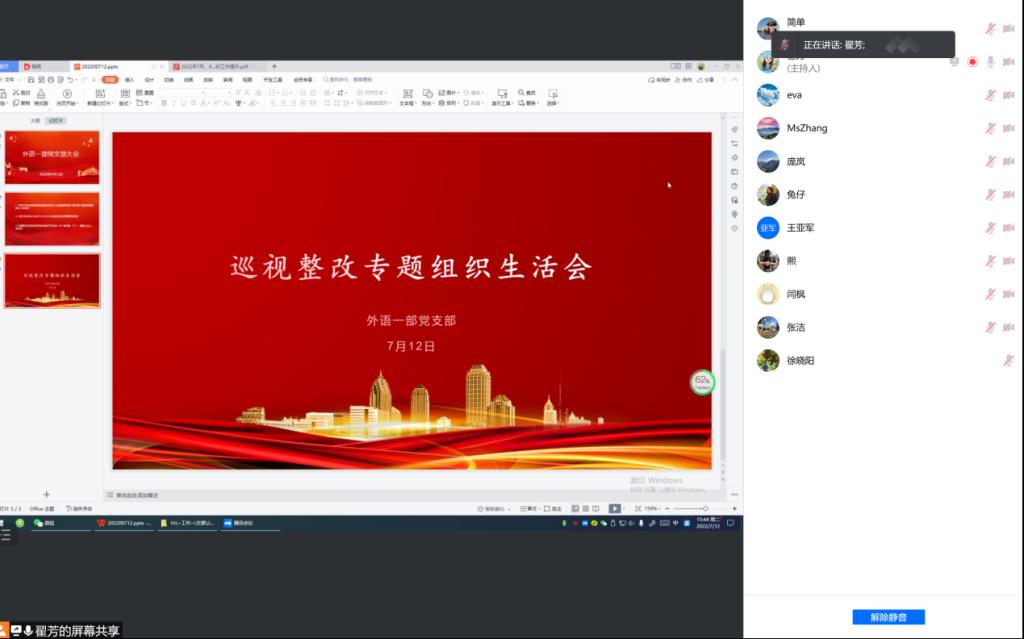 7月12日下午4点半,外语一部党支部以腾讯会议模式召开巡视整改专题组织生活会。会议由支部书记翟芳主持,副院长张洁列席了本次会议。