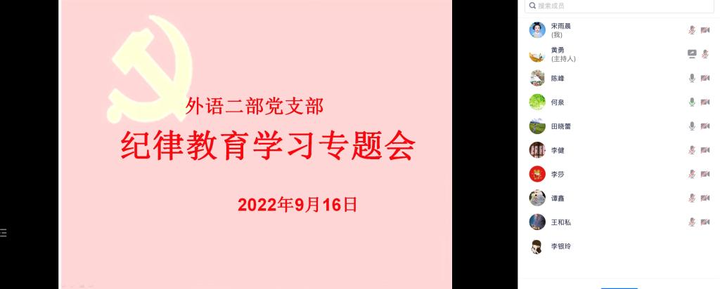9月16日下午3点,外语二部党支部使用腾讯会议召开党支部大会。会议由支部书记黄勇同志主持,外语二部党员参加了此次会议。