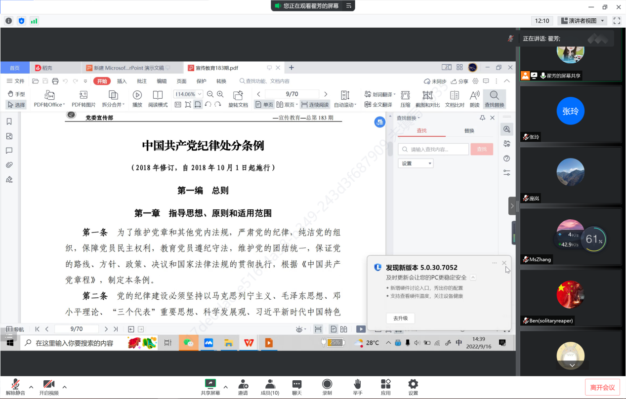 9月16日下午2点半,外语一部党支部使用腾讯会议召开党支部学习会。会议由支部书记翟芳同志主持,外语一部党员参加了此次会议。