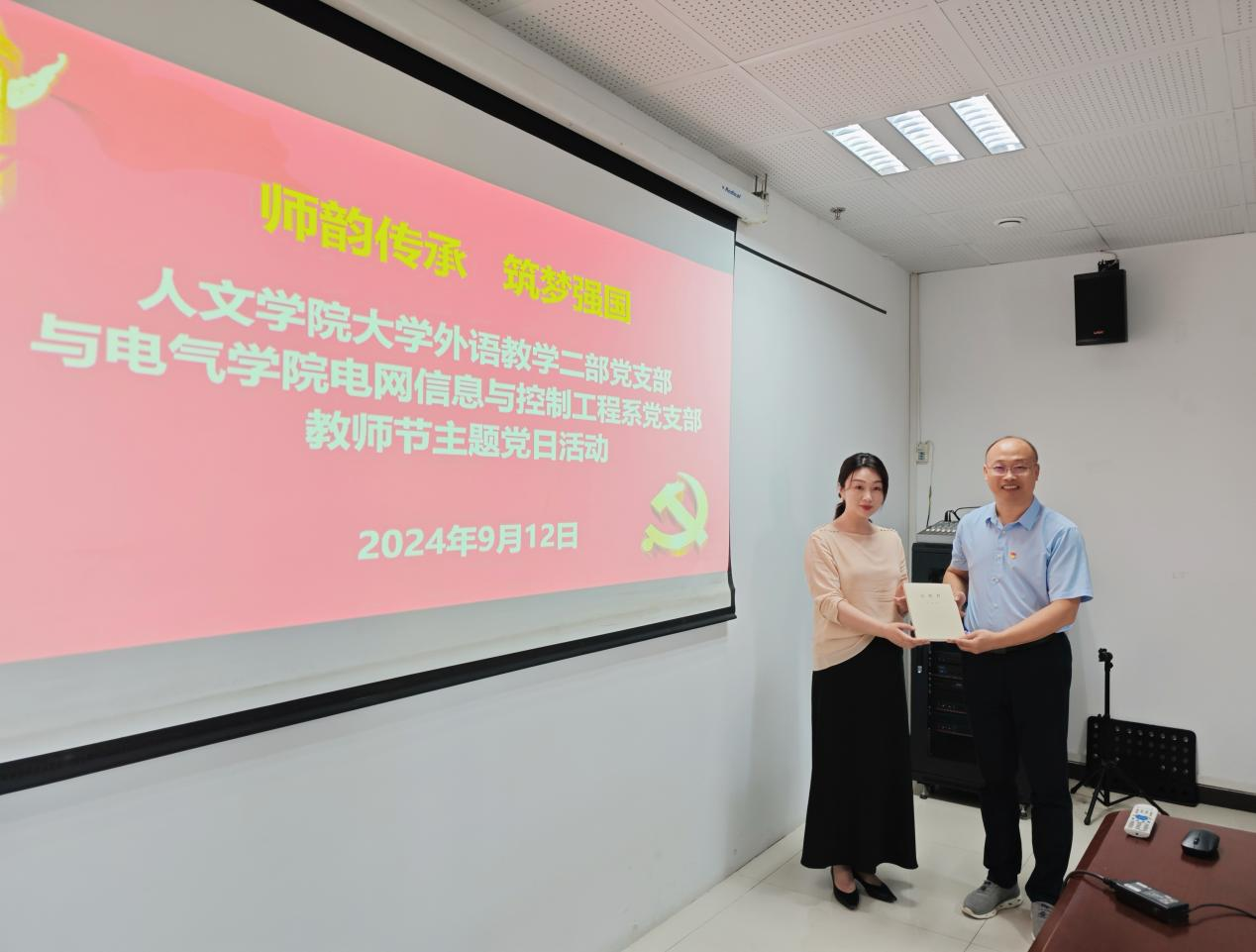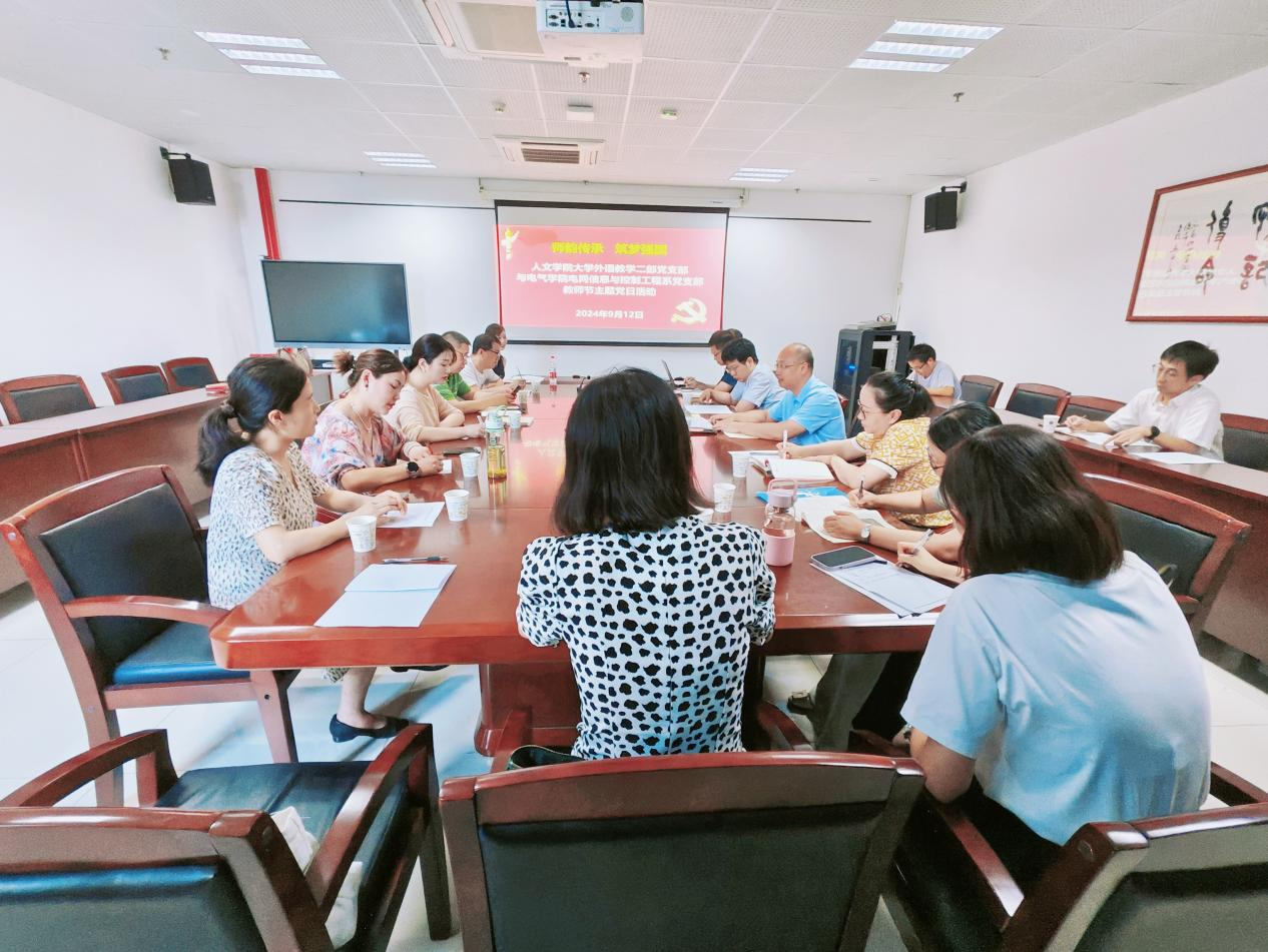 在金秋送爽、硕果累累的季节里,我们迎来了第40个教师节。为庆祝这一节日,深化党建引领下的教育教学合作,人文学院大学外语教学二部党支部与电气学院电网信息与控制工程系党支部于9月12日下午在综南楼1211会议室联合举办了以“师韵传承 筑梦强国”为主题的教师节主题党日活动。人文学院副院长黄勇、田晓蕾、电气学院副院长段建东以及两个党支部的全体党员参加了此次活动。