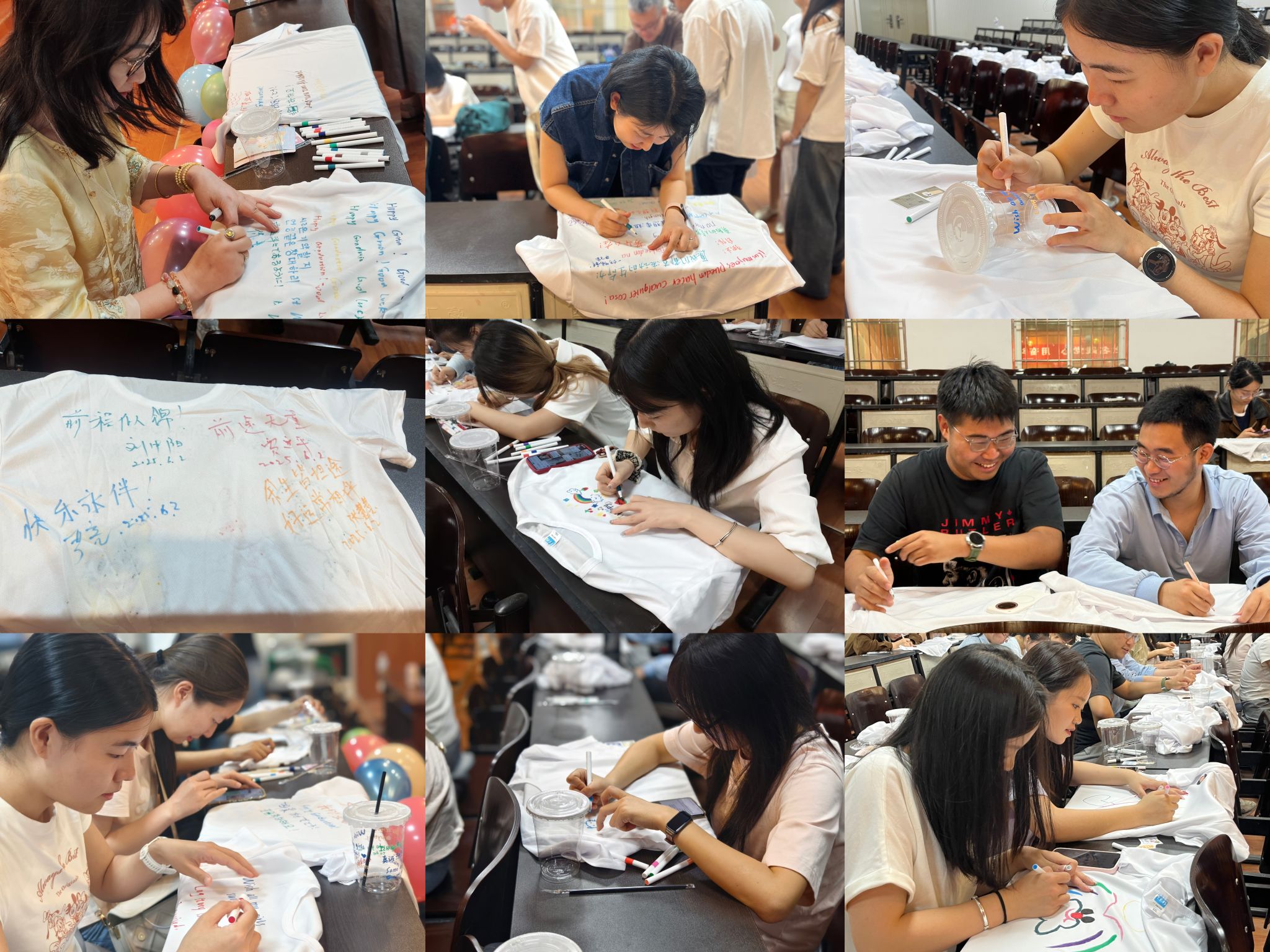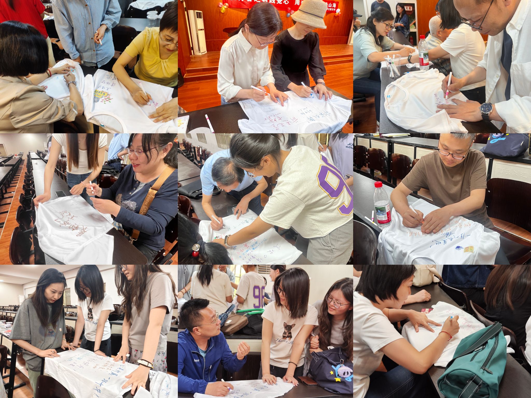 活动现场的“时光印记”创作区成为亮点:毕业生党员们用丙烯颜料在白T恤、透明水杯上精心手绘党徽、书写“青春向党,不负韶华”等誓言,将党性承诺融入文创作品。教师们现场指导并写下深情寄语:“愿如鲲鹏展翅,坚守初心逐梦”。这些满载祝福的作品,既是毕业留念,更是党组织对青年党员的精神指引。